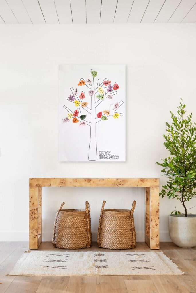 We print the gratitude tree as a 24×36” engineer blueprint at our local print shop. They prints are super cheap and only cost $3 for the 24×36” poster at our local print shop. We love the blueprint size because it makes a big impact and we can fit more leaves on our gratitude tree. Plus it doubles as cute and easy Thanksgiving decor.